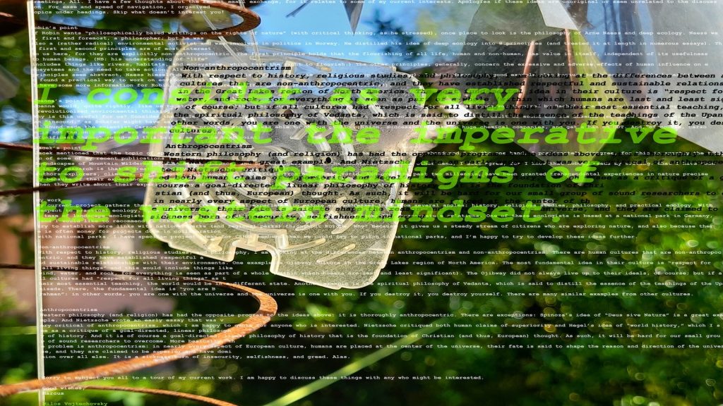 (and spirituality, which seems basically “philosophy within realm of unknown”):Since many years we have been experimenting with relationship of identity (as singular and multi-being) and sound environment with emphasis on “listening” as gateway of tuning (in between each other). Attempting to remove “ourselves” from anthropocentric position of relationship(s) with this reality seems crucial. Experiencing the same realm from perspective of non-human entity allows to observer to be impartial (unbiased) and consider role of each entity equally, free from human oriented view and interests. To re-evaluate human role in this realm, to examine human position in this model of (meta)cosmology is paramount.